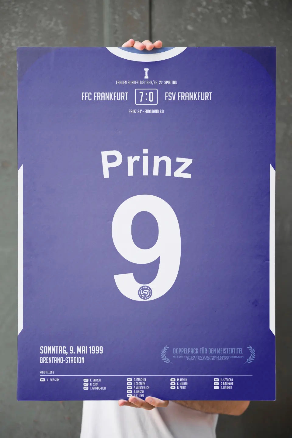 Unsere Werke sind individuell gestaltete Kunstwerke, die Fanmomente in kreativer Form interpretieren. Wir sind kein offizieller Merchandising-Anbieter und stehen in keiner Verbindung zu Vereinen, Verbänden, Unternehmen oder Einzelpersonen, die möglicherweise auf unseren Kunstwerken dargestellt oder erwähnt werden. Es besteht keine Absicht, Markenrechte, Lizenzen oder andere geschützte Inhalte zu verletzen.