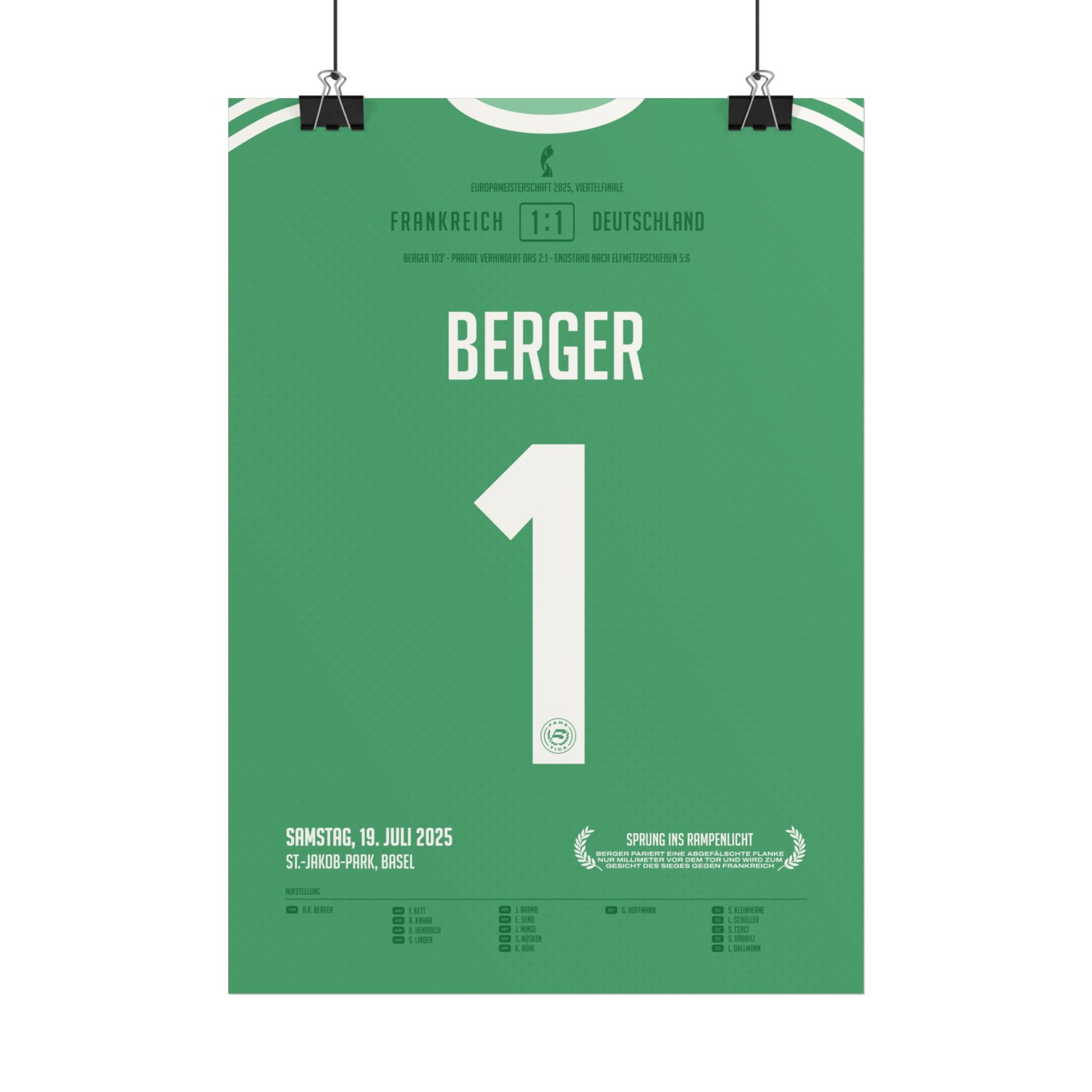 In der 103. Minute hält Ann-Katrin Berger Deutschland im Spiel: Mit einer blitzschnellen Reaktion pariert sie eine abgefälschte Flanke nur Millimeter vor der Linie. Doch damit nicht genug – im nervenaufreibenden Elfmeterschießen gegen Frankreich wird sie zur Heldin, als sie den entscheidenden Strafstoß pariert und so das 5:6 für das DFB-Team perfekt macht. Ein Spiel für die Geschichtsbücher – und Bergers ganz großer Auftritt.