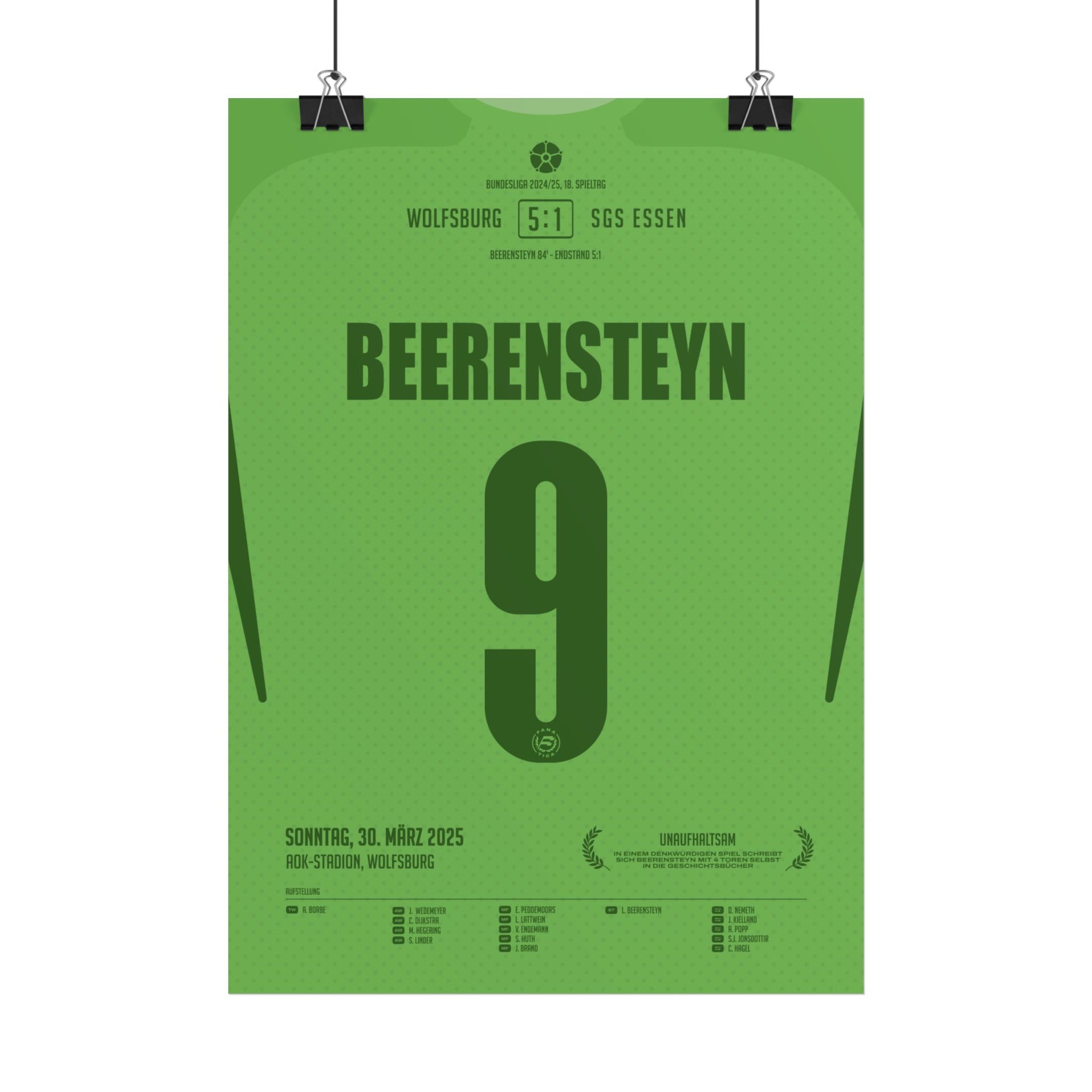 Es gibt Spiele, die über Sieg oder Niederlage hinausgehen – und dann gibt es Spiele wie dieses: Mit gleich vier Toren, darunter der Schlusspunkt in der 84. Minute, lässt L. Beerensteyn keine Zweifel offen, wem dieser Tag gehört. Unermüdlich, explosiv, eiskalt vor dem Tor – eine individuelle Glanzleistung, wie sie im Frauenfußball nur selten zu sehen ist. Ein Auftritt, der in Wolfsburgs Vereinschronik einen besonderen Platz einnimmt.